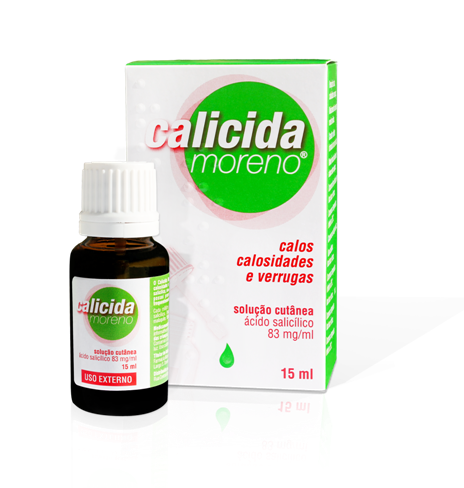Calicida Moreno (Ácido Salicílico 83 mg/ml) é um medicamento não sujeito a receita médica usado na remoção de calos, calosidades e verrugas. Leia atentamente as informações constantes na embalagem externa e no folheto informativo. Em caso dúvida ou persistência dos sintomas aconselhe-se com o seu médico ou farmacêutico. Precauções/ contraindicações/ informações indispensáveis: não deve ser utilizado em caso de hipersensibilidade à substância ativa ou a qualquer um dos excipientes. Aplicar exclusivamente sobre a zona afetada pela hiperqueratose, evitando a aplicação na pele sã. Não utilizar na face ou na zona das mucosas. Nas pessoas que sofram de diabetes, aconselha-se uma utilização sob recomendação médica ou farmacêutica. Posologia e modo de utilização: Uso cutâneo. Aplicar sobre o calo, calosidade ou verruga, evitando a aplicação na pele sã. A tampa possui um aplicador que auxilia a aplicação no local. Aplicar a solução, deixar secar e, se necessário, cobrir com um penso protetor. Salvo indicação médica, aplicar duas a três vezes ao dia. Repetir a operação vários dias consecutivos. Salvo indicação em contrário, poderá utilizar o Calicida Moreno por períodos que oscilam entre as quatro e as seis semanas. Manter fora do alcance e da vista das crianças. Fechar bem a embalagem após cada utilização. O produto não deve ser usado após o prazo de validade ter expirado. Conservar ao abrigo da luz, em ambiente seco e fresco (inferior a 25ºC). Para mais informações consulte o Folheto Informativo e o RCM, ou contacte o titular de AIM. Entidade promotora: Moreno II - Produtos de Saúde, Lda. Rua Central do Olival, 2272, 4415-726 Olival VNG Portugal, NIPC 500016240. PUBLICIDADE. Divulgação Junto do Público em Geral. Última revisão: Outubro de 2017.